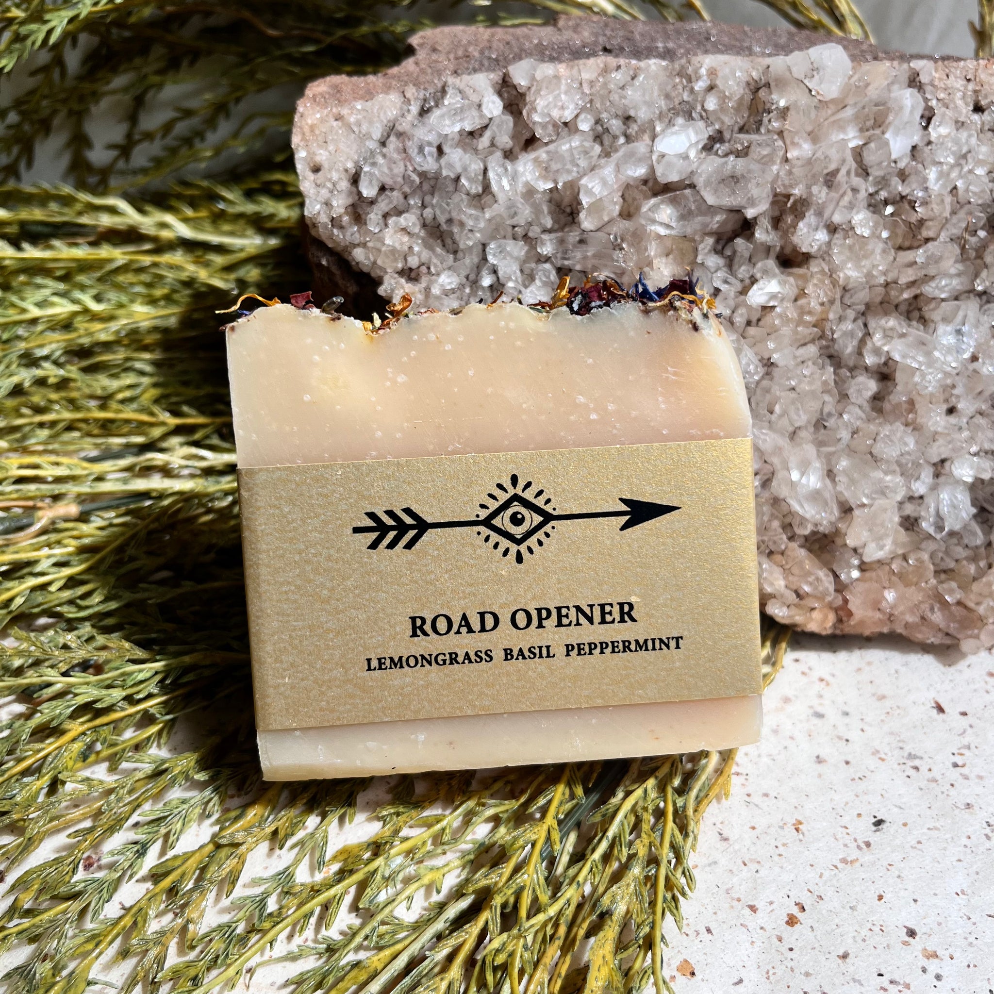 Olive oil, organic coconut oil, distilled water, sodium hydroxide, goat’s milk, shea butter, organic botanicals, mica, cross roads dust, proprietary blend of organic essential oils.