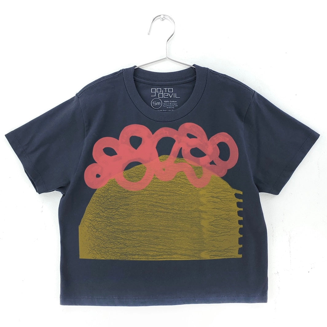 100% cotton garment-dyed heavyweight boxy tee. High-waisted with a relaxed fit. Hand printed by Go To Devil in Austin, TX!