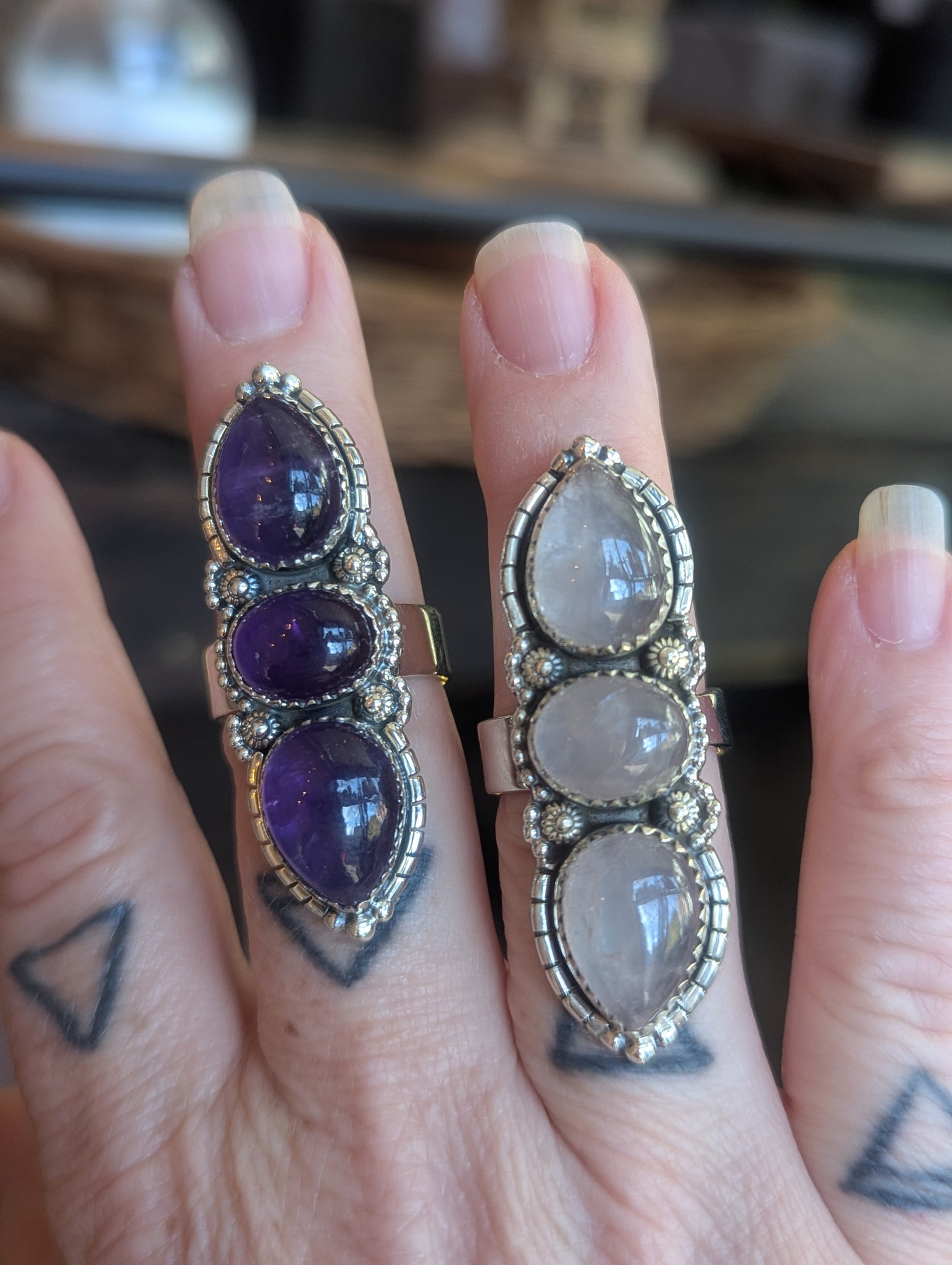 Three amethyst crystals set on a discreetly adjustable sterling silver band. Handcrafted by Foxlark in their studio in Savannah, GA.