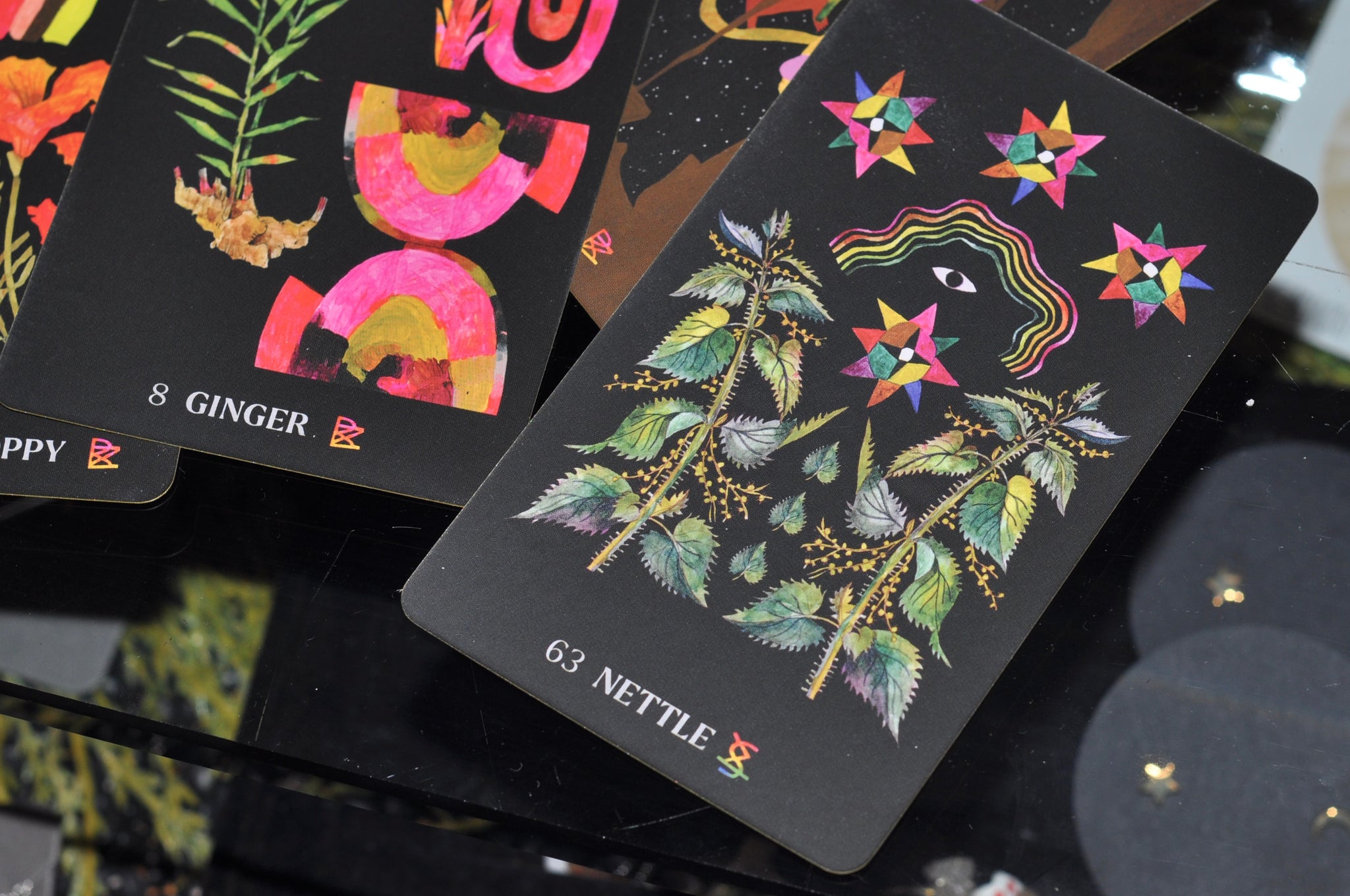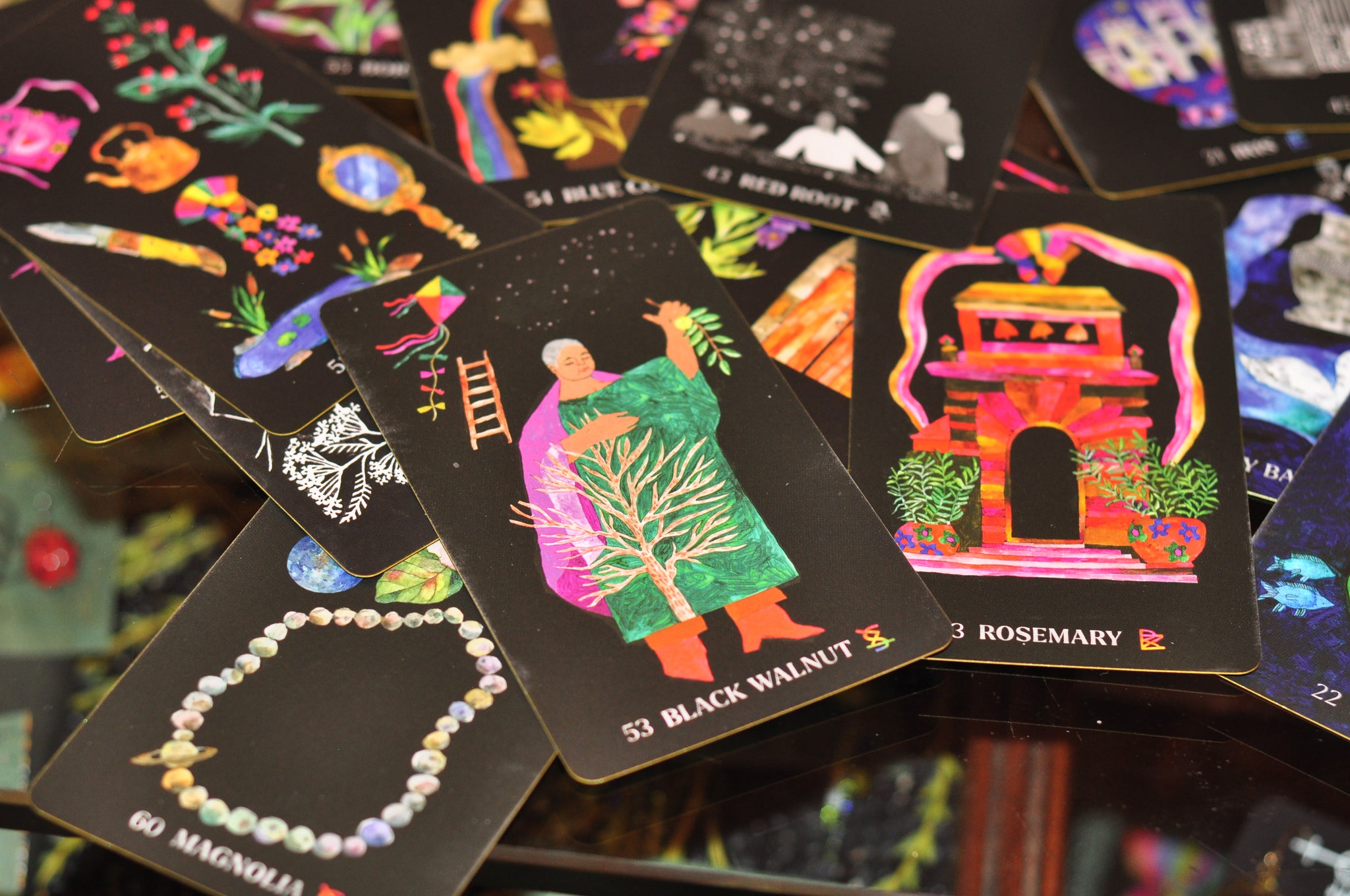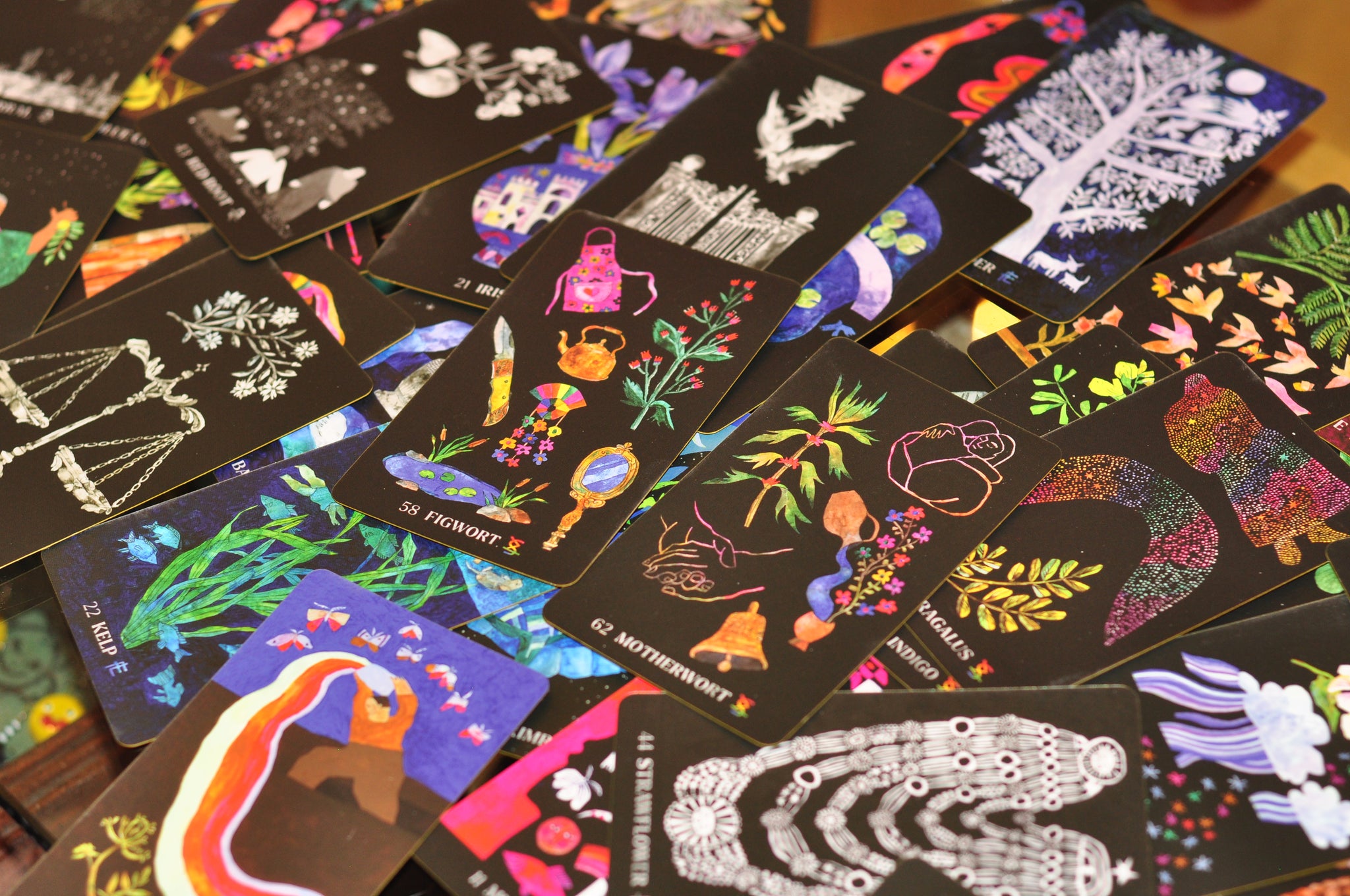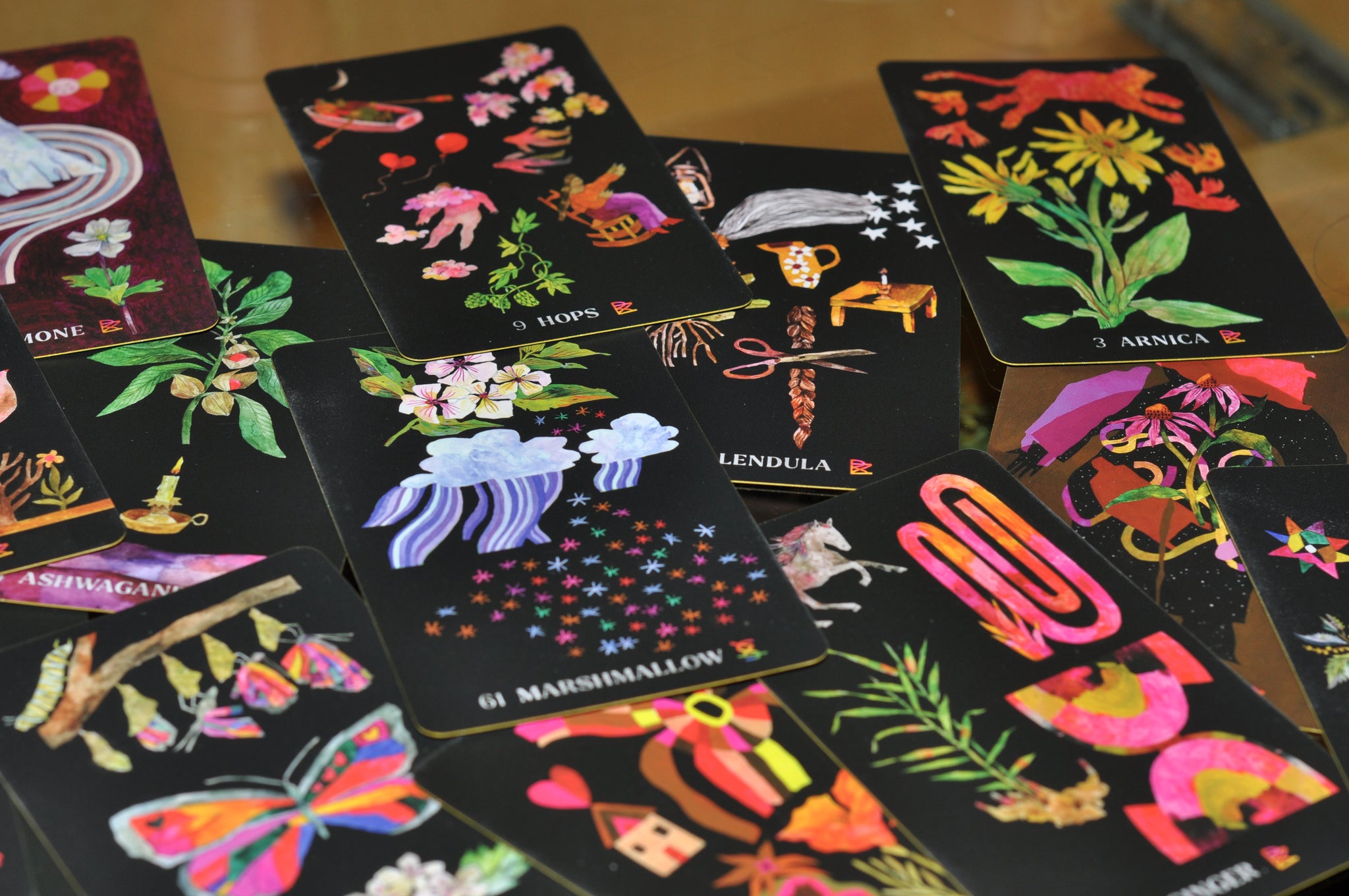 65-card deck with vibrant illustrations: Each card highlights a single plant, from Calendula to Yarrow, with a vivid, whimsical watercolor illustration on the front, along with the plant's name and suit. A unifying card back illustration brings cohesion to this stunning deck, while sprayed metallic edges on the cards Inspiring guidebook for further reflection: The accompanying flexibound book offers deep insights into the magic of each suit—including colors, elements, energetic signatures, weather, metals, emotions, and landscapes—and the specifics of each plant. Both deeply researched and soulfully written, these card-specific entries guide readers in developing a relationship with their deck.