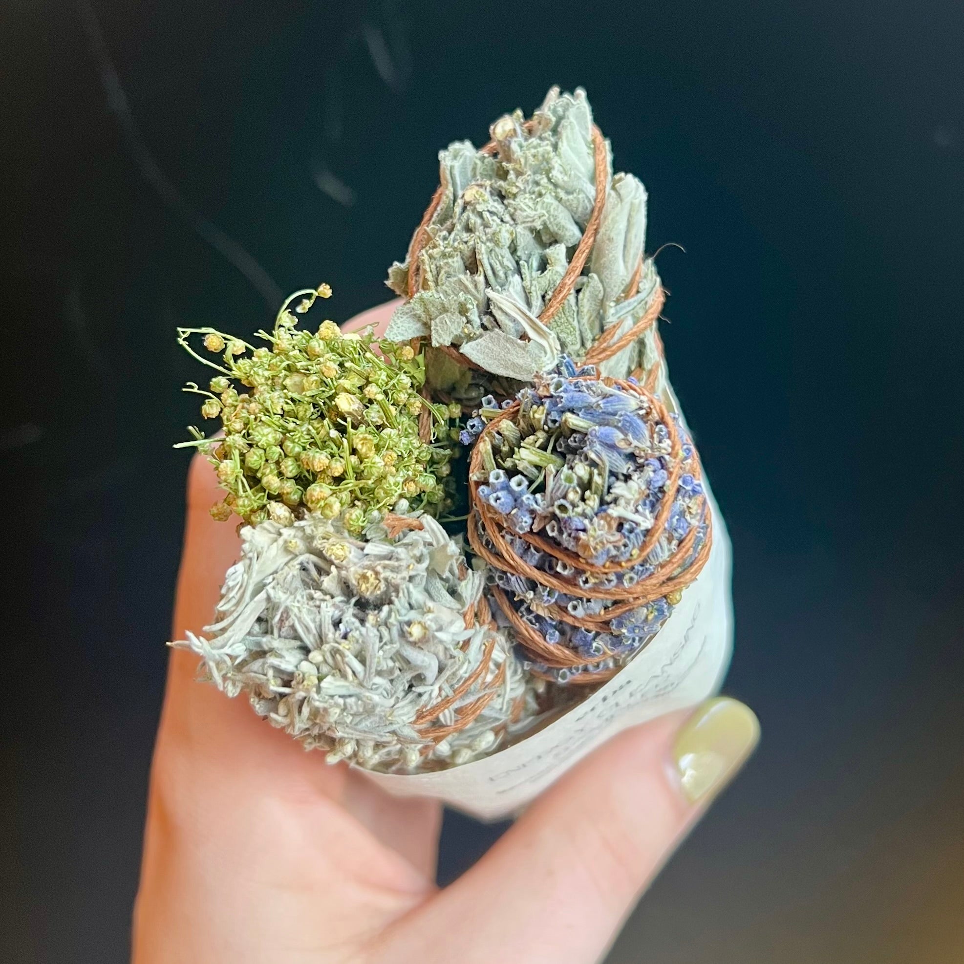A set of 3 mini herbal bundles approximately .25oz and 3" each. Garden Sage, Silver Artemisia, Wormwood lavender cleansing bundle. Hand-tied with naturally dyed hemp cord.